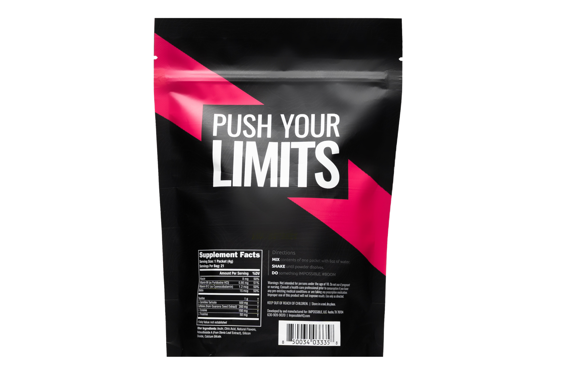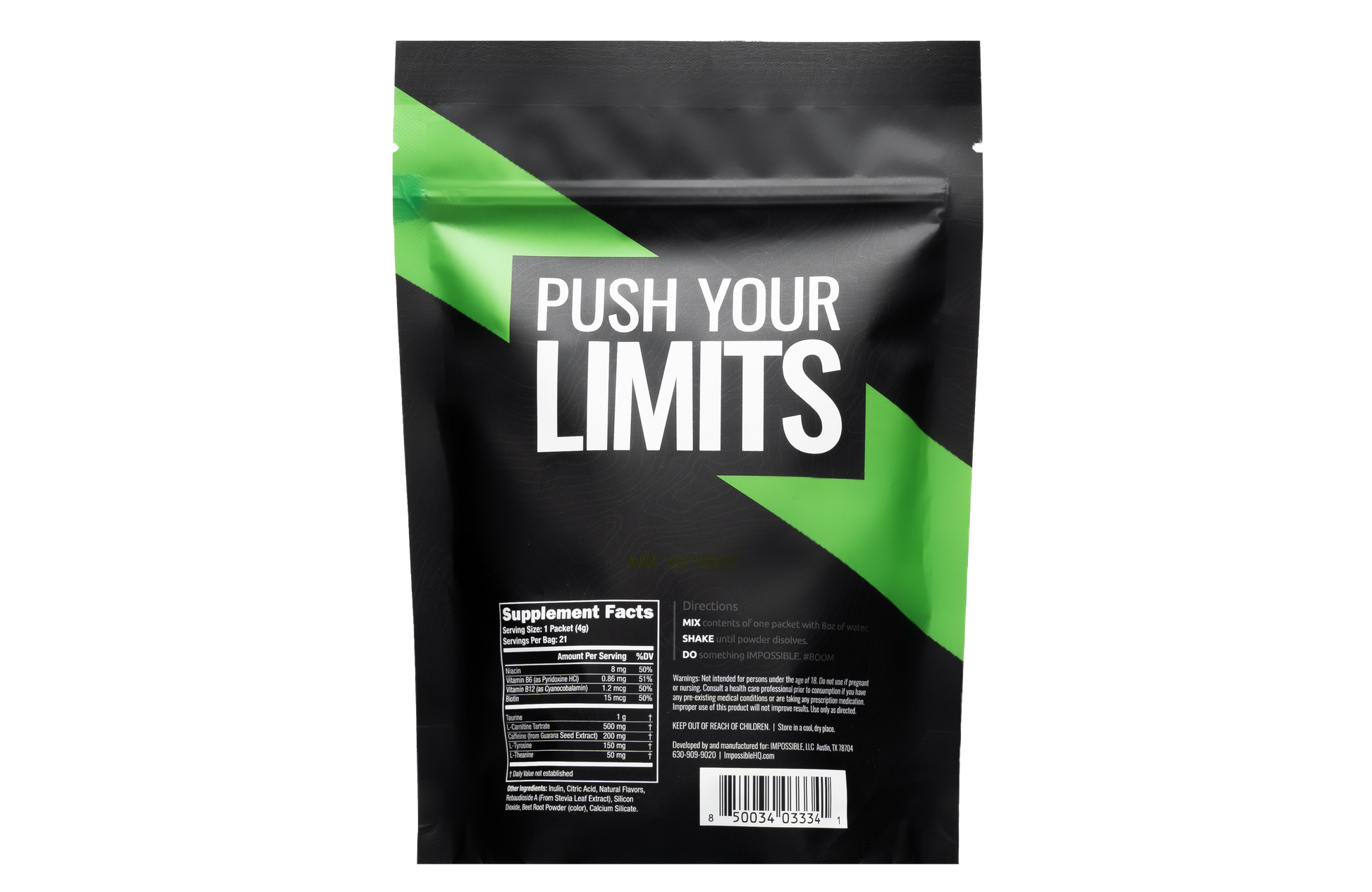 Impossible Energy is a clean energy drink mix designed to help you push your limits and do something impossible. Whether it's running an ultra marathon, squeezing in a workout in the middle of the day or getting the last push in on a mountain adventure - Impossible Energy is designed to be a clean, healthy energy drink mix that gives you long, sustained energy with zero crash and zero added sugar.